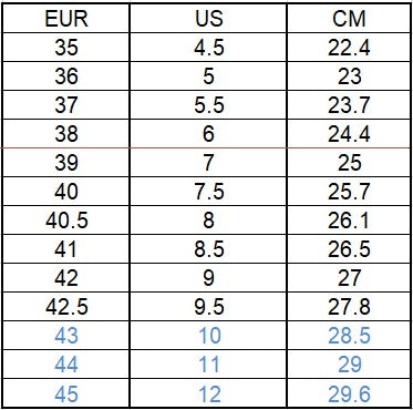 Antes de realizar tu compra por favor revisa que la talla sea la correcta, a continuación esta es nuestra tabla de medidas por talla, información que figura por lo general en la etiqueta tallera ubicada en la lengüeta de cualquiera de tus zapatillas, contrasta los centímetros que es lo mas importante saber!
